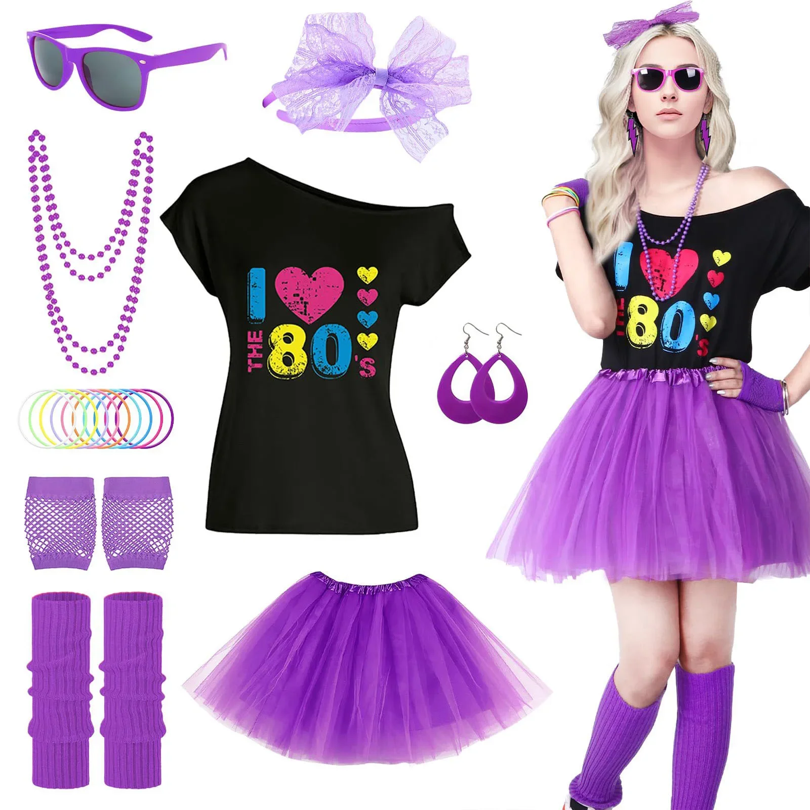 【80s Costume Accessories Set Includes】- Our 80s accessories for women includes 1pc 80s T-Shit, 1pc tutu skirt, 2pcs fishnet gloves, 2pcs 80s leg warmers, 1pc cool 80s sunglasses, 1pc lace headband, 4pcs earrings, 2pcs neon necklace and 10pcs silicone bracelets. Great for 80's costume accessories and Halloween costume.